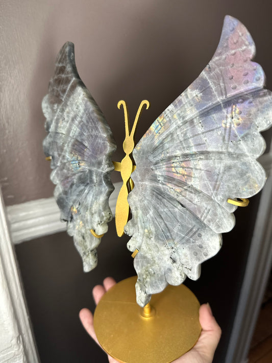Big Labradorite Butterfly Wing Set On Golden Display Stand