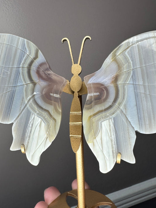 Banded Agate Amethyst Butterfly Crystal Wings on a Display Stand